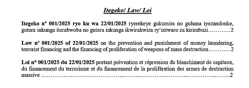 Rwanda’s AML/CFT Law No 001/2025 of 22/01/2025 establishes clear obligations for each concerned authority including reporting persons, supervisory authorities, and law enforcement agencies to ensure compliance with international AML/CFT standards and safeguard the country’s financial system. For more details, click on this link: https://www.fic.gov.rw/index.php?eID=dumpFile&t=f&f=122353&token=523a0c131e45384e1dfe8e2baba0234921c392a3